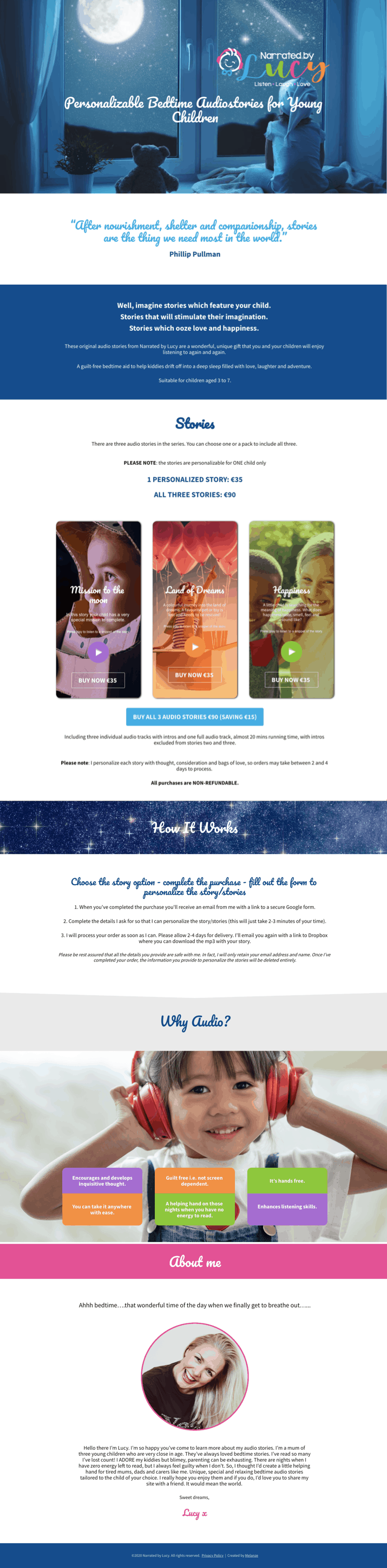Lucy has three young kids herself and reads them many stories. She wanted other mothers to have bedtime stories for their children, featuring their children as well! The designer took her new brand colors and created this fun colored design! The page is created on LeadPages.