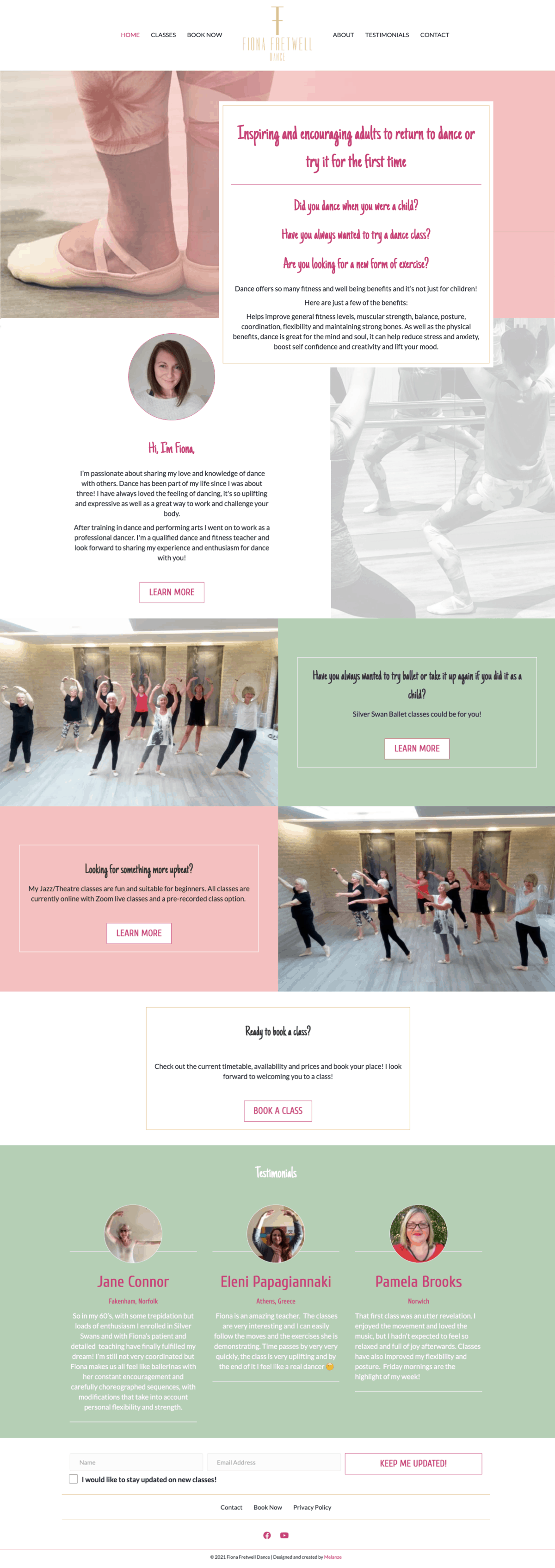 Fiona started working online during the pandemic after working in person teaching dance for years. She wanted a website to make the transiution complete. Now she has a place to sent people to book her classes adn eventually offer mor eoptions to her clients, locally and world wide. The designer created a design that fit with her dancing and she loved it when she got it! The website is created with Beaver Builder theme and builder.